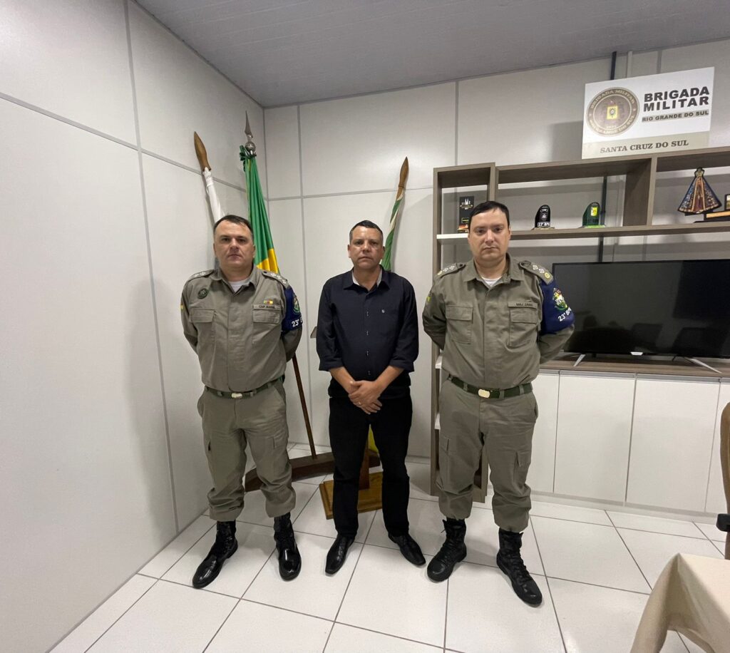 Na ocasião, o subcomandante, major Fabricio Broll Zago, e o comandante da 1ª e 2ª companhias, capitão Rafael Carvalho Menezes, recepcionaram o Sr. Jeferson para tratar de assuntos de segurança pública.