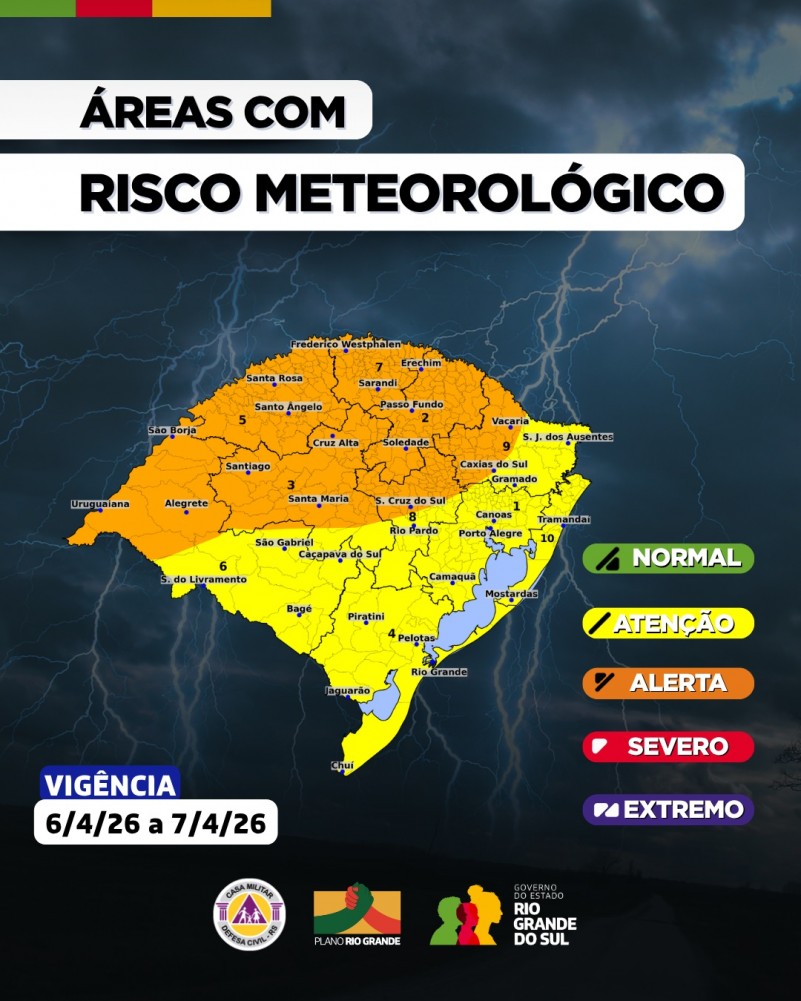 Na tarde e noite desta segunda-feira (6/4), há condição para tempestades acompanhadas de rajadas de vento que podem superar os 90 km/h, chuva pontualmente forte e queda de granizo isolado nas regiões Oeste, Missões, Noroeste, Norte, Centro, Campanha e partes do Sul, Vales, Serra e Região Metropolitana de Porto Alegre (RMPoa). O risco de rajadas de vento intensas e chuva forte é maior a partir da noite, quando tempestades avançam pela região Oeste em direção ao Centro. Os acumulados oscilam entre 10 e 50 mm/dia, chegando pontualmente até 90 mm/dia no Oeste, Centro e Campanha. O mar fica agitado e com ressaca.