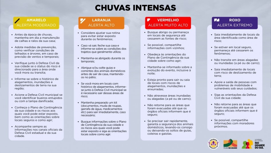 Neste cenário atenta-se para o risco de cheias em arroios, córregos e pequenos rios, além de alagamentos em áreas urbanas conforme a intensidade da chuva. Já os rios de maior porte devem registrar elevações moderadas, sem riscos de inundações, com recuperação dos limiares baixos.