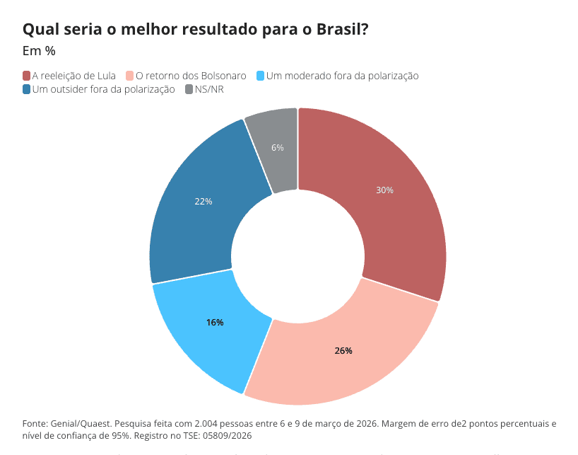 Enquanto isso, 38% escolheram outra opção, se dividindo entre quem prefere “um outsider fora da polarização” (22%) e quem prefere “um moderado fora da polarização” (16%).
