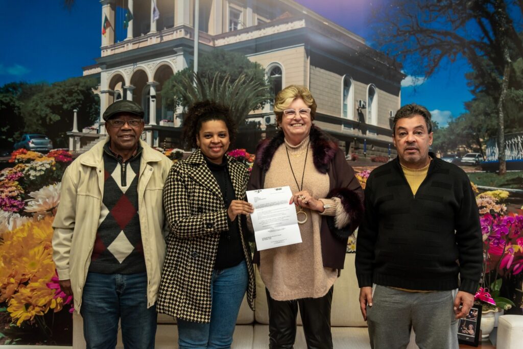 Para a entrega do convite, compareceram a presidente da entidade, Marta Regina dos Santos Nunes, o vice-presidente, Clóvis Roberto Silveira, e o diretor de patrimônio, Fábio Ricardo dos Santos Nunes.
