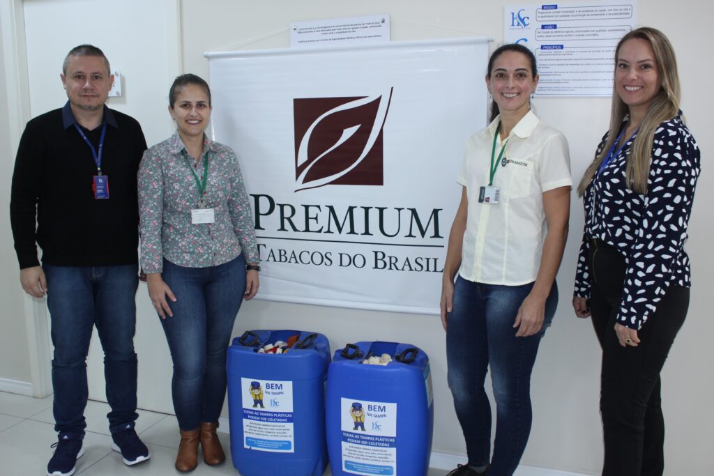 O Hospital Santa Cruz (HSC) recebeu nesta segunda-feira, dia 8, a doação de tampas plásticas arrecadadas pela Premium Tabacos do Brasil para o projeto Bem na Tampa. A entrega foi feita pelas integrantes da Comissão Interna de Prevenção de Acidentes (Cipa) da empresa, Kelen Hackmann de Souza e Rosa Silveira, aos assistentes de projetos e captação de recursos do Hospital, Tamara Riediger e Evandro Leal Melo.