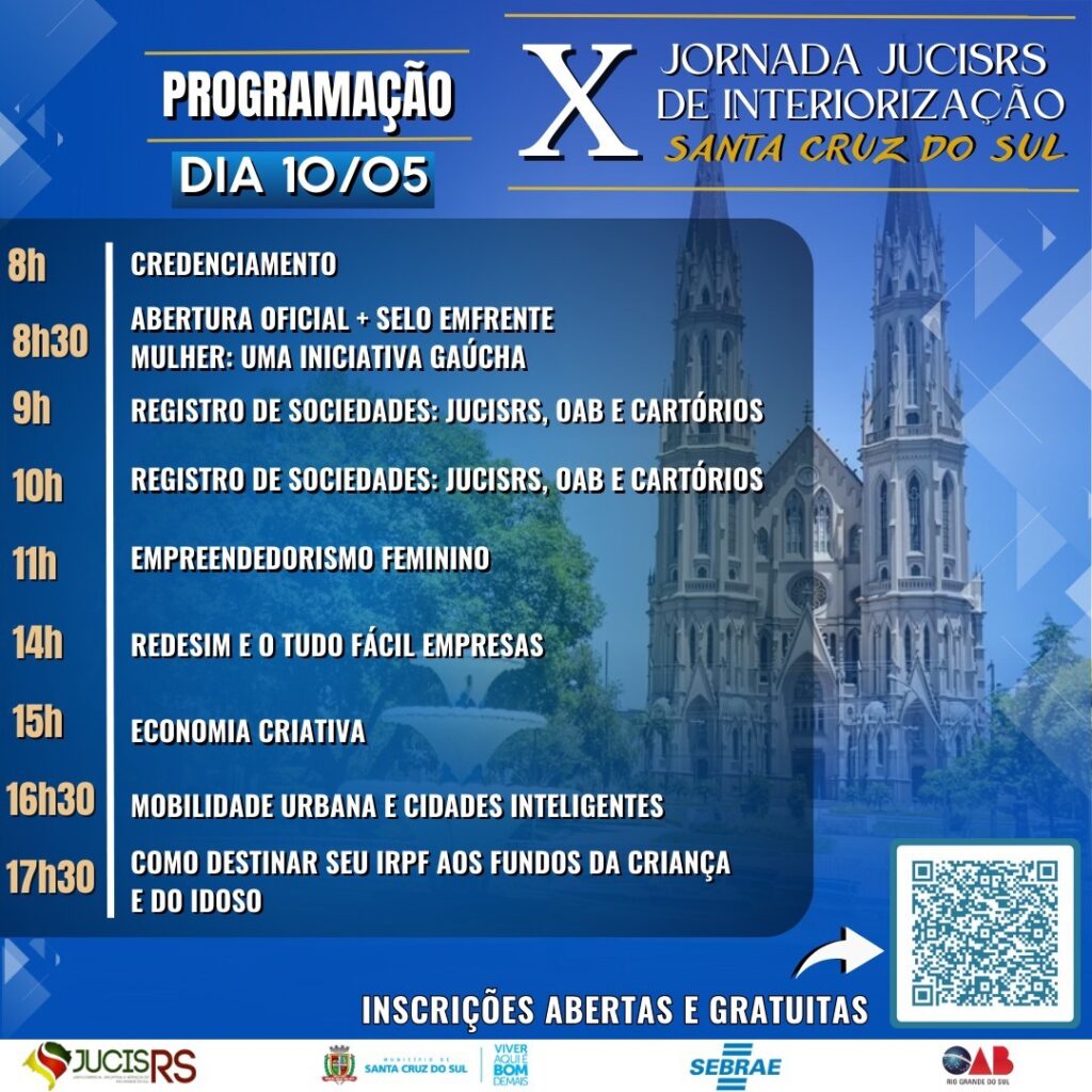 As inscrições são gratuitas e podem ser feitas pelo link https://www.even3.com.br/x-jornada-jucisrs-de-interiorizacao-santa-cruz-do-sul?organizador=a2e8ccb9-88f4-4f5a-95c8-24466a4bb773&share=false&unique=true&private=true.