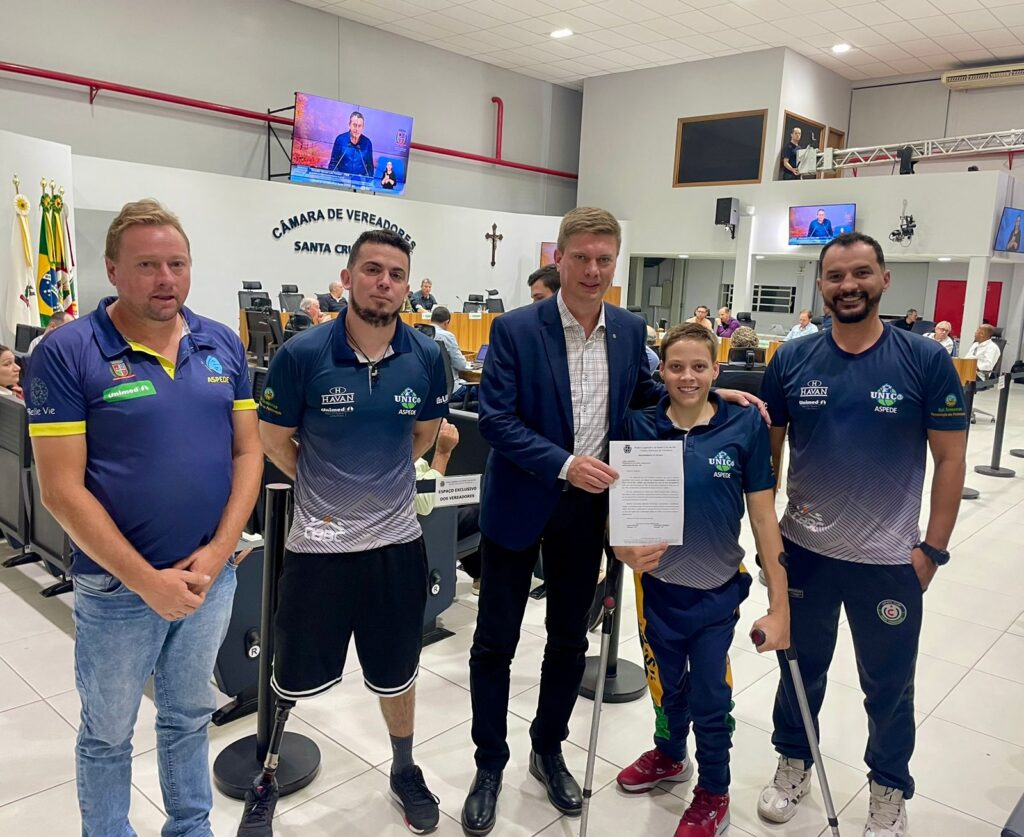 Santa Cruz do Sul – O vereador Henrique Hermany (Progressistas) fez a entrega de uma moção de congratulação à Associação Santa-cruzense de Pessoas com Deficência (Aspede) pela vitória no Torneio Amistoso de preparação para o Campeonato Brasileiro de Basquete em cadeira de rodas.
